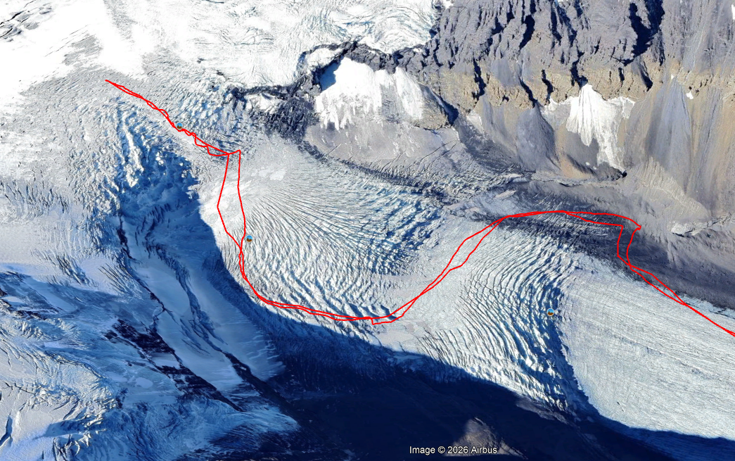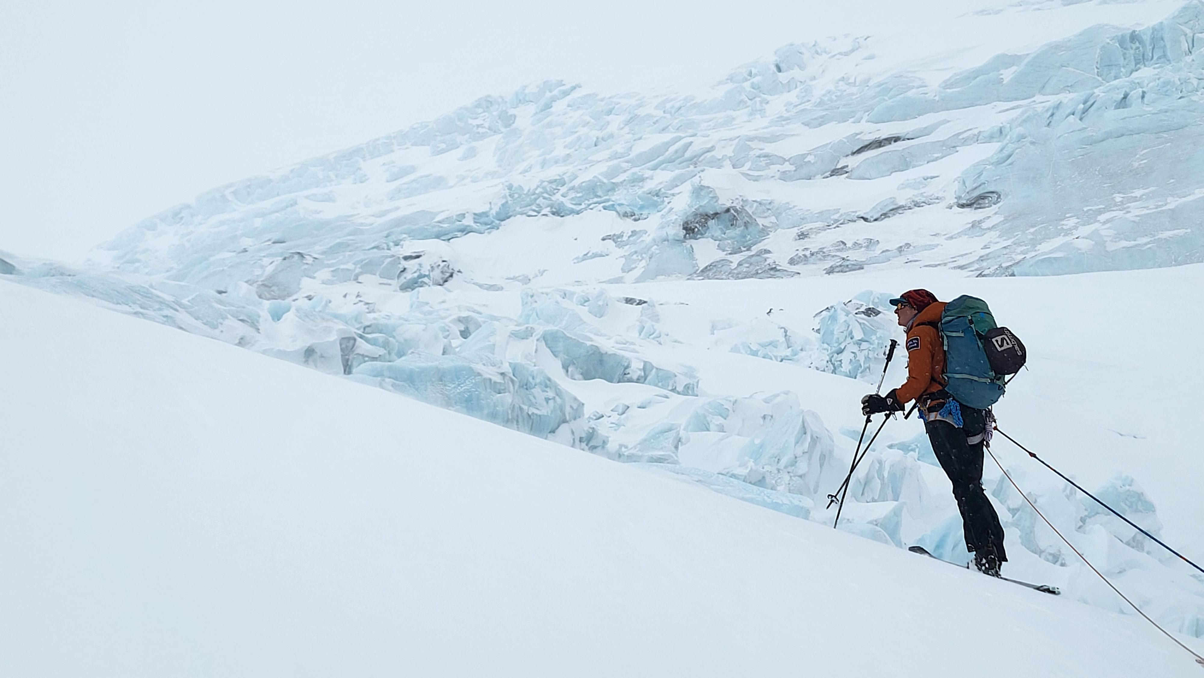 For the descent, we chose to retrace the route, gliding out along both icefall benches and minimizing our exposure to the Snowdome seracs.