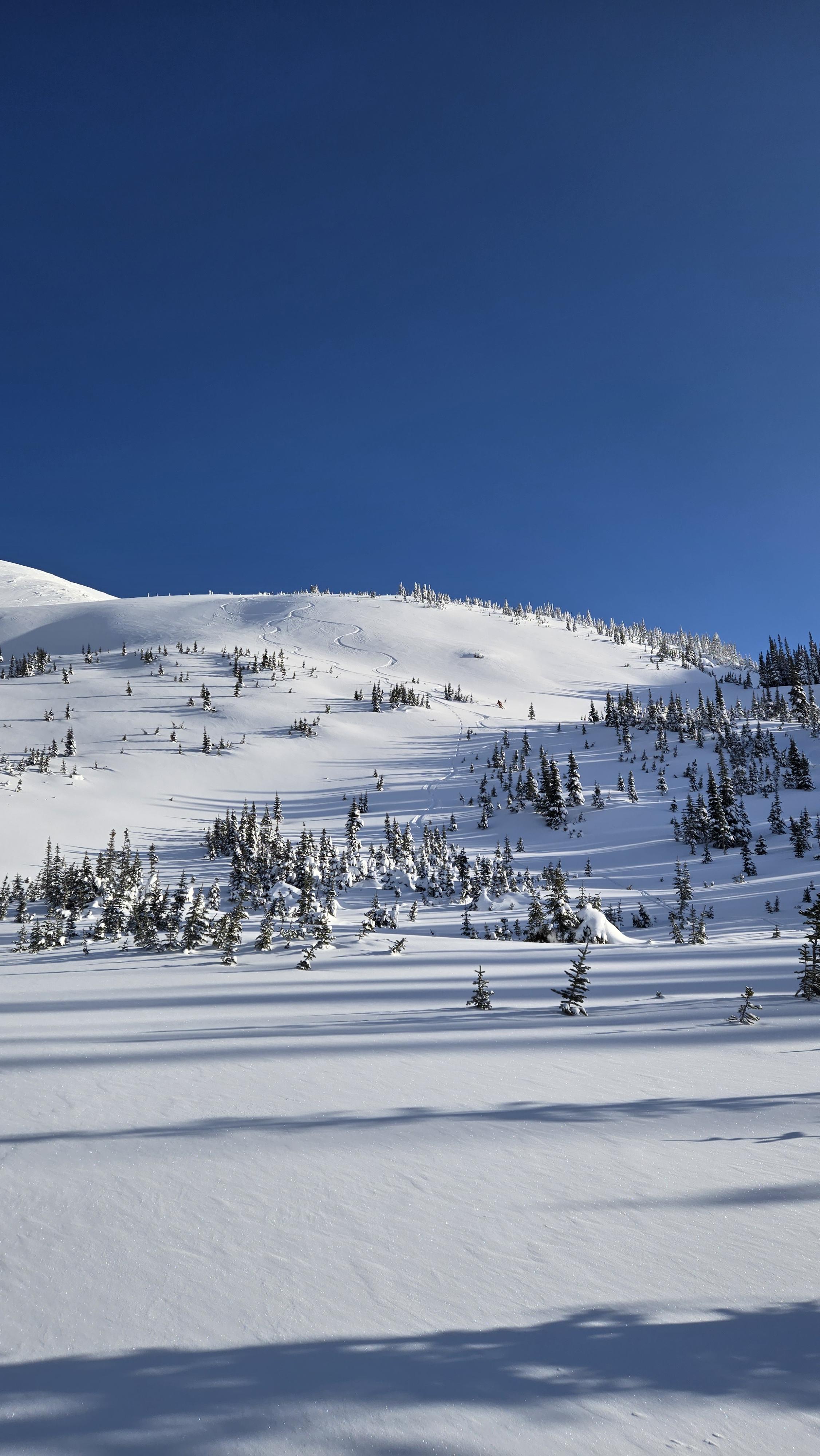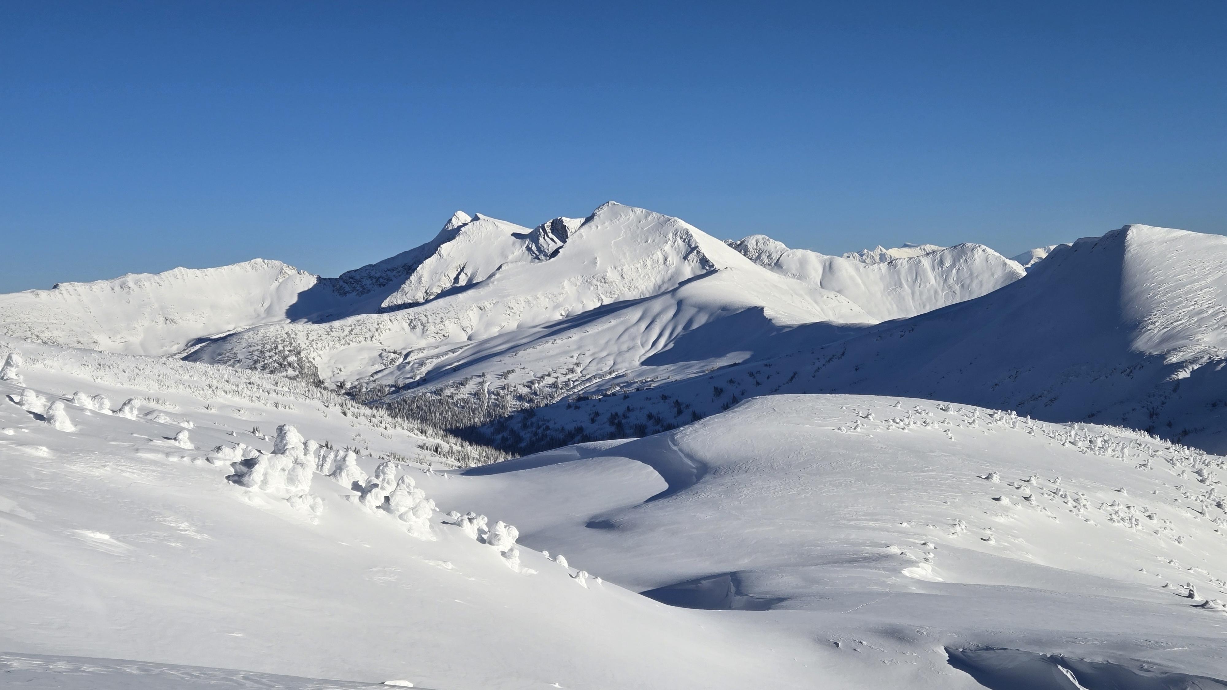 Snowpack: On the Rockies side, HS 160cm at TL; Cariboos side, 185cm. Mid-Dec. MFcr down 60cms breaking down around 1900m on the Cariboos side. HS 270 on the glacier. Due to the strong winds at TL/ALP today, there was a bit of an upside-down snowpack with 4F surface snow and F underneath with ski pen. up to 30cms. We were most concerned for windslabs at TL/ALP and were really surprised at how wind-affected the snow was well down into TL, far below ridge crest. With the colder temps, and gusty winds, they seemed stubborn to trigger but was the most concerning layer this weekend.